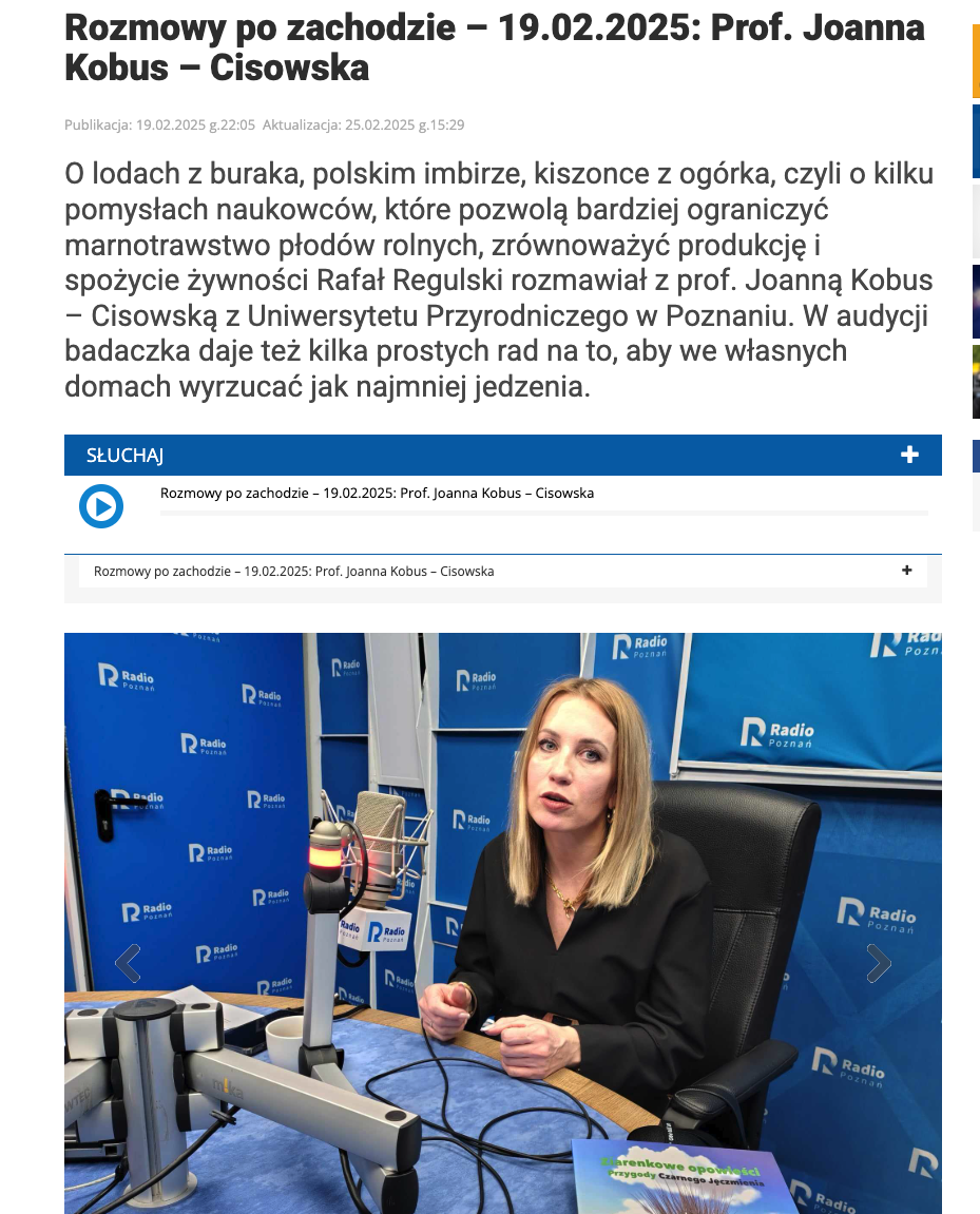 Prof. dr hab. Joanna Kobus-Cisowska miała okazję promować dotychczasowe wyniki projektu KISZMISZ na antenie radia. W trakcie audycji omówiła innowacyjne rozwiązania związane z zagospodarowaniem ogórka pozaasortymentowego oraz podkreśliła znaczenie projektu dla branży spożywczej i zrównoważonego rozwoju. Dzięki jej wystąpieniu szersze grono odbiorców mogło dowiedzieć się o korzyściach płynących z efektywnego wykorzystania surowców oraz potencjale nowych technologii w przetwórstwie warzyw. Zachęcamy do śledzenia naszych dalszych działań oraz kolejnych wystąpień medialnych związanych z projektem KISZMISZ!